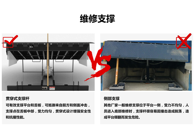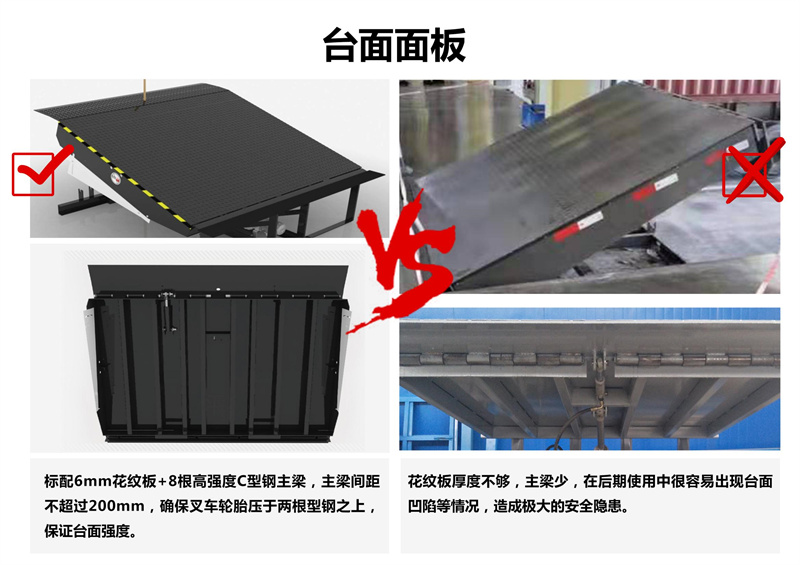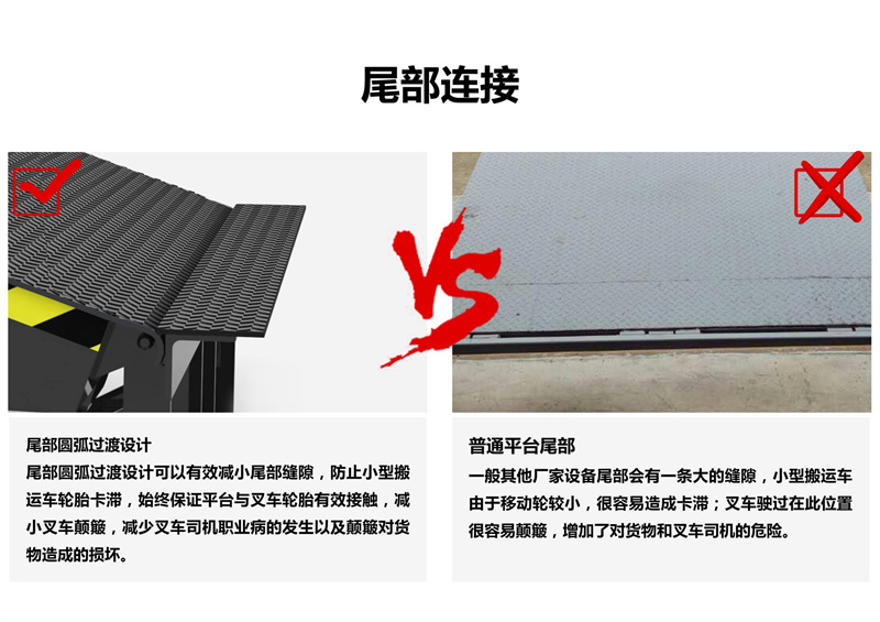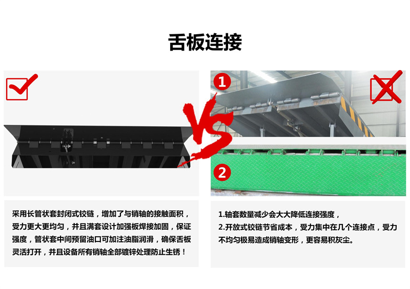 調(diào)節(jié)板兩側(cè)分別有3塊活動板,可有效避免調(diào)節(jié)板下降時壓傷腳趾的危險,以確保安全。固定式登車橋調(diào)節(jié)板底座前面為開放式設(shè)計,清理雜物方便快捷。