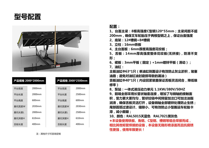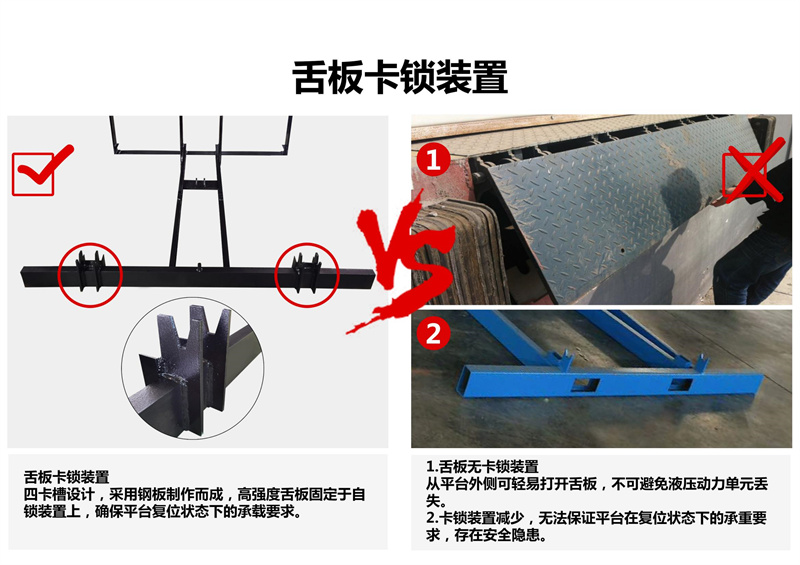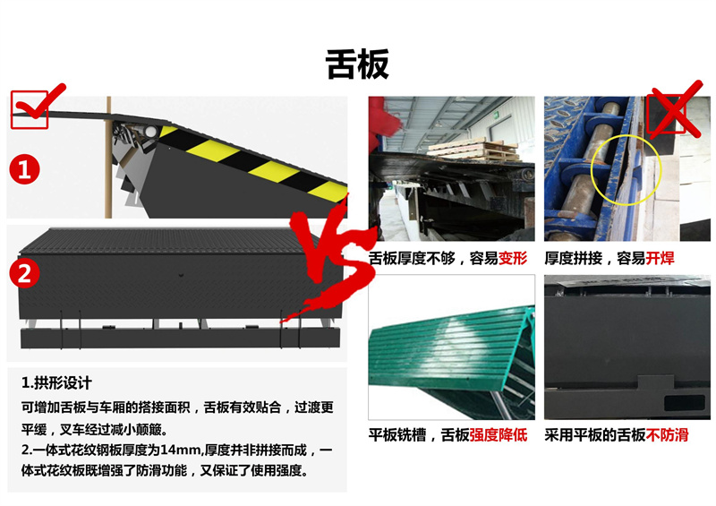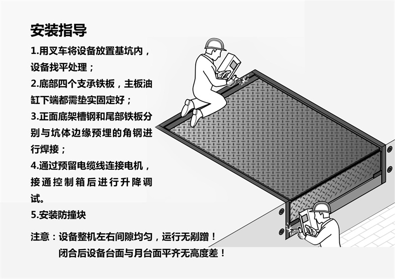 通過動力系統(tǒng),大油缸升起整個斜板,至頂位時,小油缸開始工作,順暢伸出活頁搭板, 高度調(diào)節(jié)板全部采用濟南濟鋼優(yōu)質(zhì)高度花紋鋼板及型材緊密焊接,壽命長久。