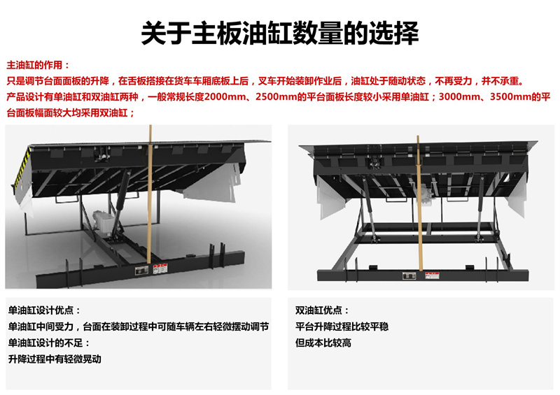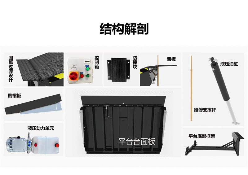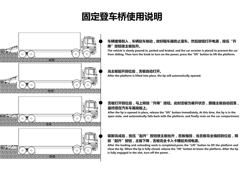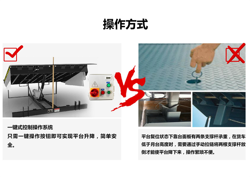 電控操作只需按動按鈕,調(diào)節(jié)板會自動升起,操作極其簡單;松開按鈕,調(diào)節(jié)板靠自重下降, 活頁搭板搭在貨車上即可使用。